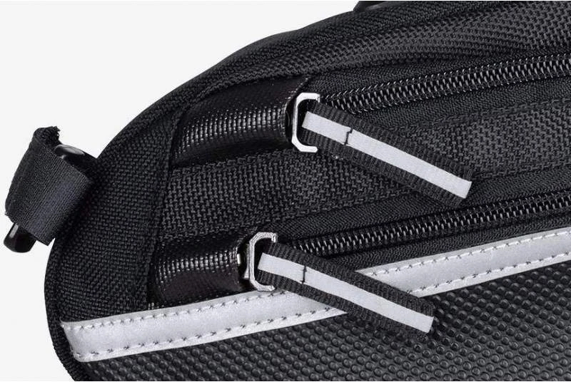 En las versiones mediana y grande, el espacio cubierto por la cremallera esconde un pliegue que permite ampliar la capacidad de la bolsa. Incorpora detalles reflectantes y una correa de soporte para luz trasera.