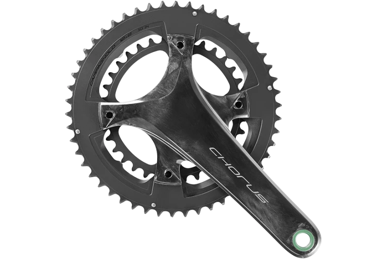 El nuevo plato Chorus es un verdadero concentrado de tecnología y versatilidad. Es técnicamente avanzado porque aprovecha la tecnología de construcción unidireccional en fibra de carbono obtenida directamente del molde sin ninguna pintura superficial y utiliza el perno Ultra-Torque de acero como el plato Record. Es versátil, ya que el nuevo círculo de bulones de 123mm confiere una estructura de prestaciones extremas, al tiempo que asegura una más amplia variedad de segmentos de uso. Disponible con bielas de 165, 170, 172,5 y 175 mm, el nuevo y reducido círculo de bulones del plato Chorus lo hace compatible con engranajes 52/36, 50/34 y con las nuevas coronas 48/32.