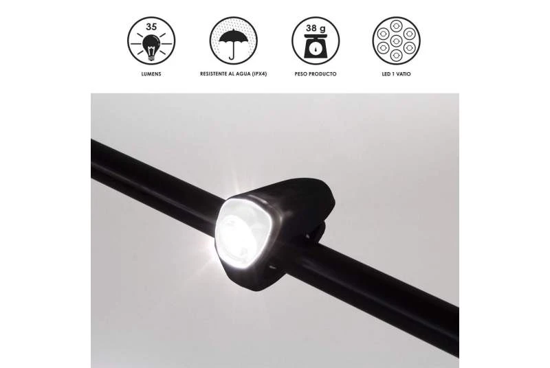 El faro delantero recargable de 35 lúmenes de Eltin cuenta con un led blanco super brillante de un vatio. Es una luz resistente al agua (IPX-4) Incluye distintas funciones y duraciones