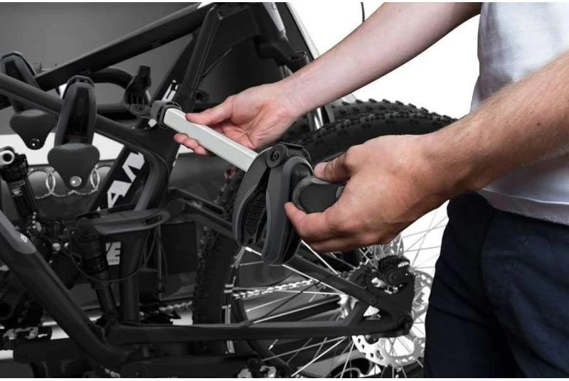 - Montaje sencillo de las bicicletas mediante brazos desmontables con limitadores de apriete bloqueables Thule AcuTight que “hacen clic” cuando se logra el apriete óptimo
